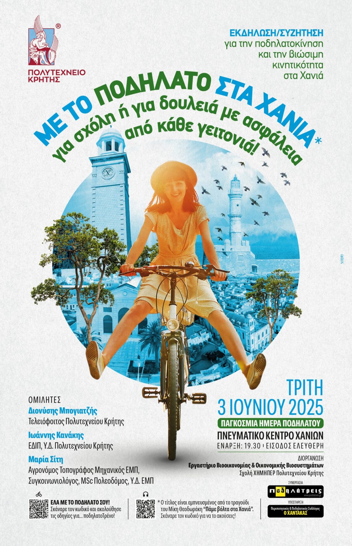 Τρίτη 3 Ιουνίου Παγκόσμια Ημέρα Ποδηλάτου 1. Ποδηλατοτρένο. 2. Εκδήλωση Έχουμε πολύ δρόμο ακόμα ώσπου τα Χανιά να γίνουν φιλικά προς τους ποδηλάτες, τους πεζούς και τα ΑμεΑ. Για αυτό δημιουργήθηκαν οι ποδηΛάτρεις. Κι αφού τα Χανιά έχουν λίγα μόνο μέτρα ποδηλατικών υποδομών είπαμε να τσουλήσουμε τις ρόδες στους μελλοντικούς ποδηλατόδρομους που προβλέπονται στο Σχέδιο Βιώσιμης Αστικής Κινητικότητας (Σ.Β.Α.Κ.), που αναρωτιόμαστε αν θα μπει ποτέ στις ράγες. Κάτι σαν το τρένο στην Κρήτη που λένε κάποιοι …Επιβιβαστείτε λοιπόν στο ποδηλατοτρένο! Κυκλική διαδρομή: κέντρο – Κλαδισός -Μουρνιές – κέντρο, 14 σταθμοί επιβίβασης / αποβίβασης, πινακίδες με ακριβείς χρόνους αναχώρησης, αντίστροφο εισιτήριο…