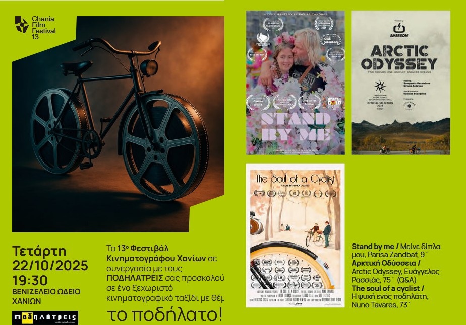 Το 13ο Φεστιβάλ Κινηματογράφου Χανίων και οι ΠΟΔΗΛΑΤΡΕΙΣ σας προσκαλούν σε ένα μοναδικό κινηματογραφικό ταξίδι αφιερωμένο στο ποδήλατο! 📅 Πότε: Τετάρτη 22 Οκτωβρίου 2025, ώρα 19:30 📍 Πού: Βενιζέλειο Ωδείο Χανίων Ελάτε να απολαύσουμε μαζί τρεις υπέροχες ταινίες για την ποδηλατική κουλτούρα. Σας περιμένουμε! 🍿 Οι ταινίες της βραδιάς: 🚲 Stand by me / Μείνε δίπλα μου (Σκηνοθεσία: Parisa Zandbaf, Διάρκεια: 9′) 🏔️ Αρκτική Οδύσσεια / Arctic Odyssey (Σκηνοθεσία: Ευάγγελος Ρασσιάς, Διάρκεια: 75′ – θα ακολουθήσει Q&A) ❤️ The Soul of a Cyclist / Η ψυχή ενός ποδηλάτη (Σκηνοθεσία: Nuno Tavares, Διάρκεια: 73′)
