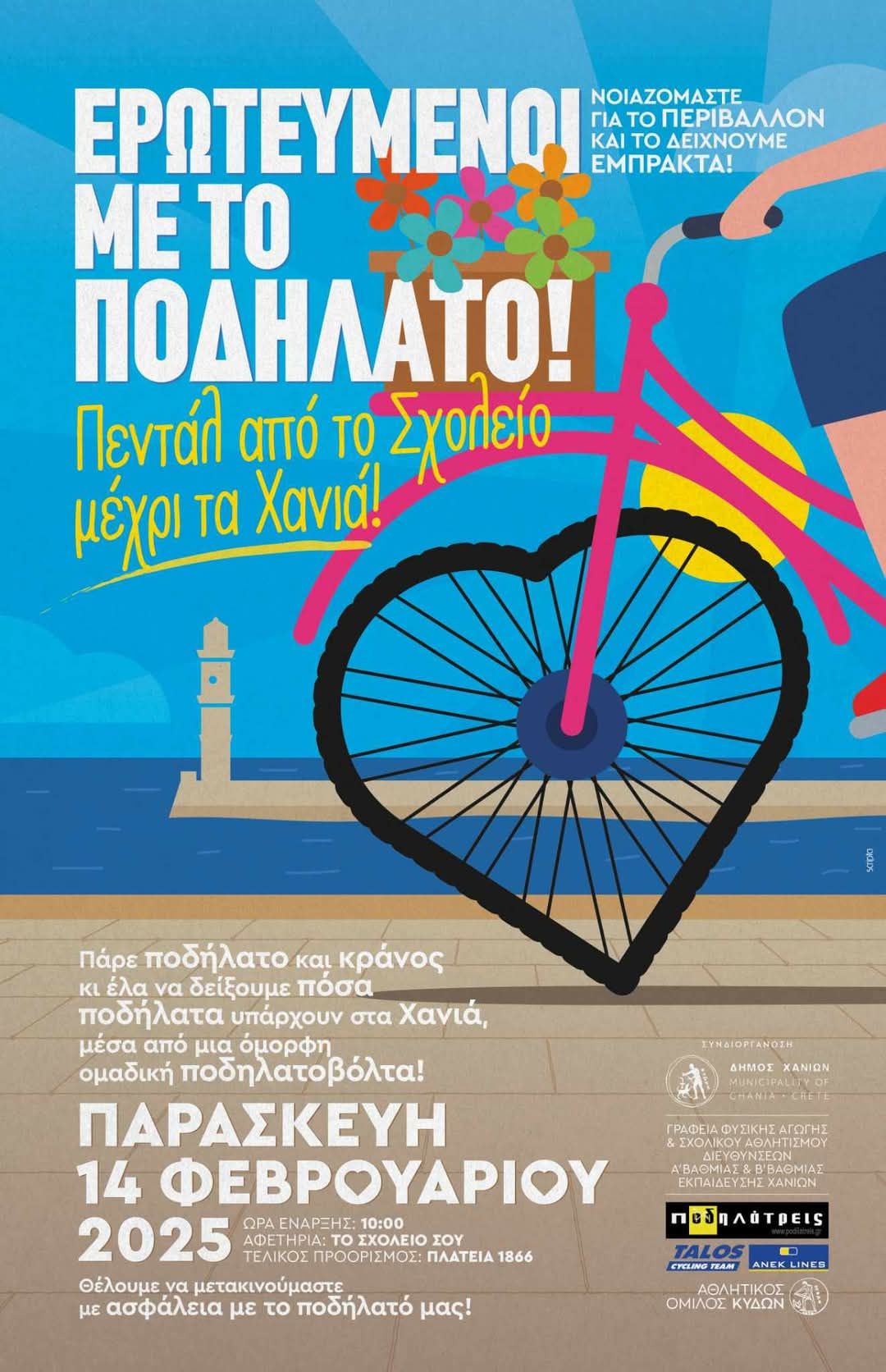Ερωτευμένος; Ερωτευμένη; Εμάς τους ποδηΛάτρεις το λέει η … λέξη. Και οι γάμπες μας. (Κι οι καρδούλες μας που κινούμαστε σε τέτοιες συνθήκες). Οπότε την Παρασκευή 14 Φεβρουαρίου θα ποδηλατήσουμε μαζί με μαθητές και μαθήτριες και θα σχηματίσουμε δύο μεγάλα ποδηλατικά “τρένα” από τις γειτονιές προς το κέντρο των Χανίων. Και αντίστροφα. Τί ζητάμε; Μόνο ένα πράγμα: να πηγαίνουν οι μαθητές με ασφάλεια στο σχολείο τους, είτε με τα πόδια είτε με το ποδήλατο. Αν συμφωνείς γίνε κι εσύ ποδηΛάτρης και βοήθησε: Πώς; Αν έχεις ποδήλατο έλα μαζί μας στις 9.30 ( πλ. 1866) να συνοδεύσουμε / προστατεύσουμε τα παιδιά.…